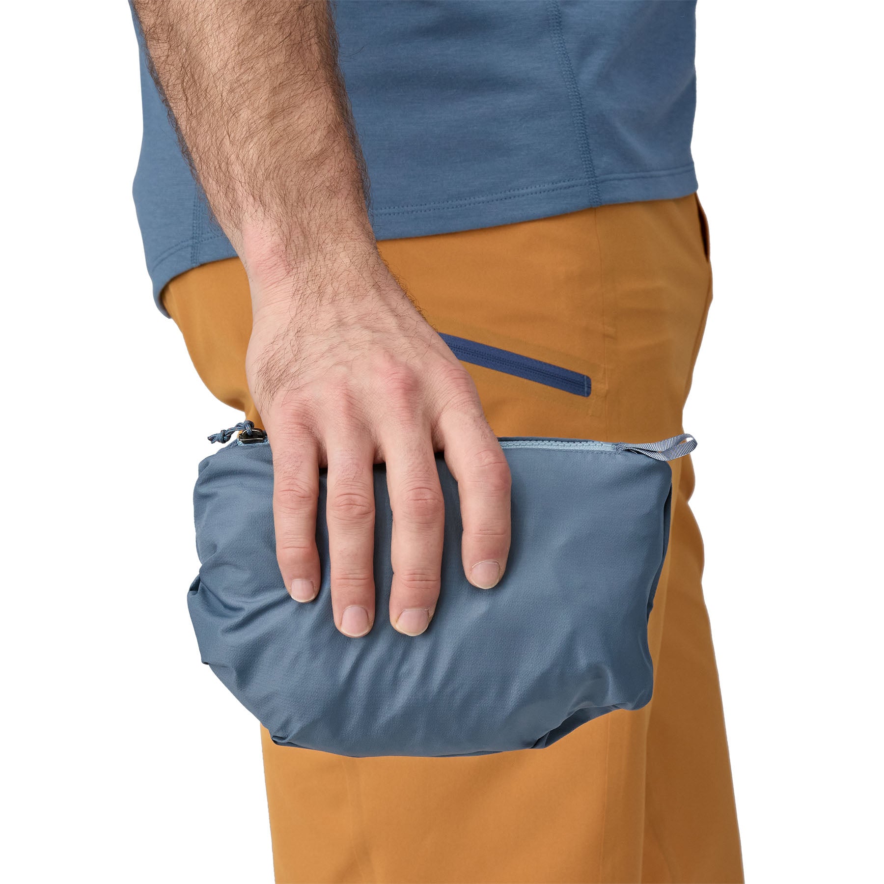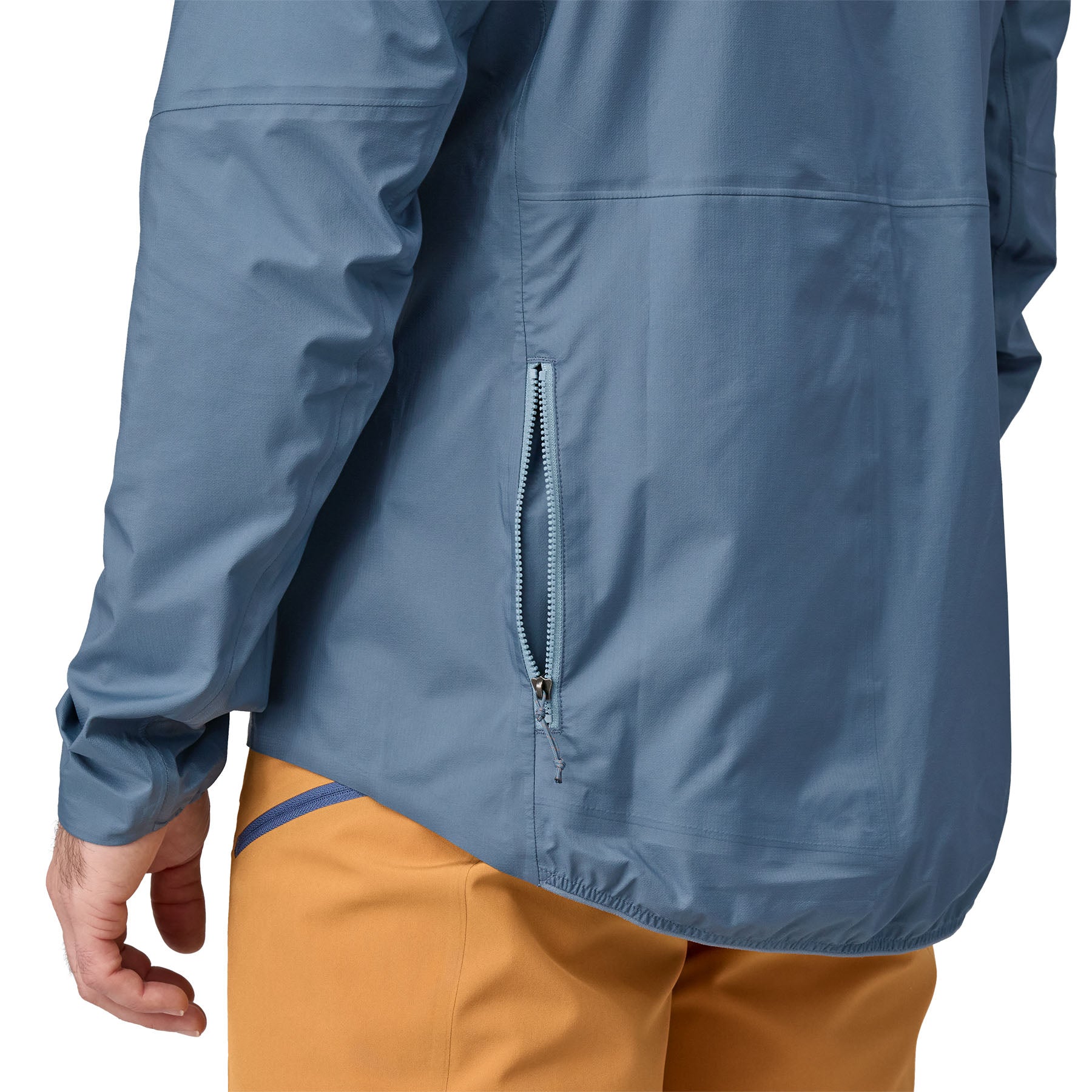 Jacket packs into secure rear pocket, or can be rolled into the cinch hood and tied around the waist with jacket arms