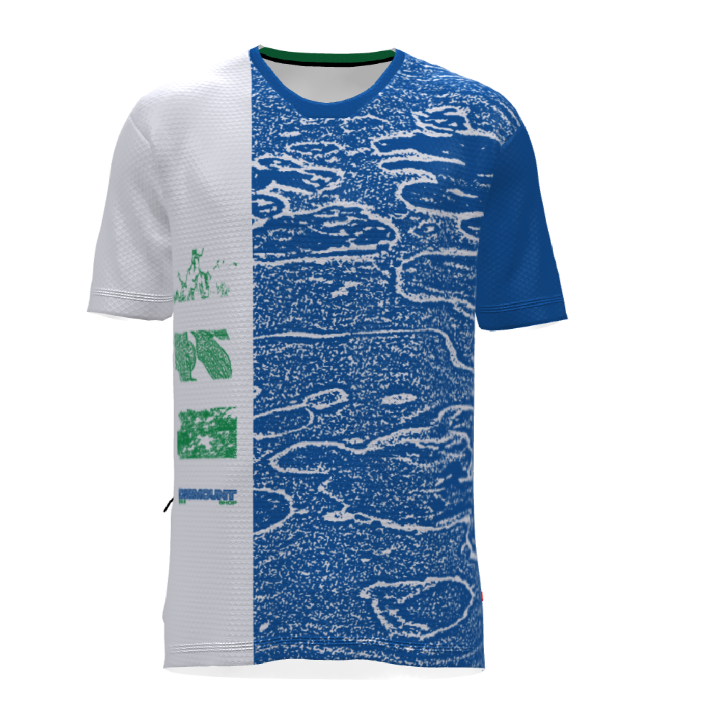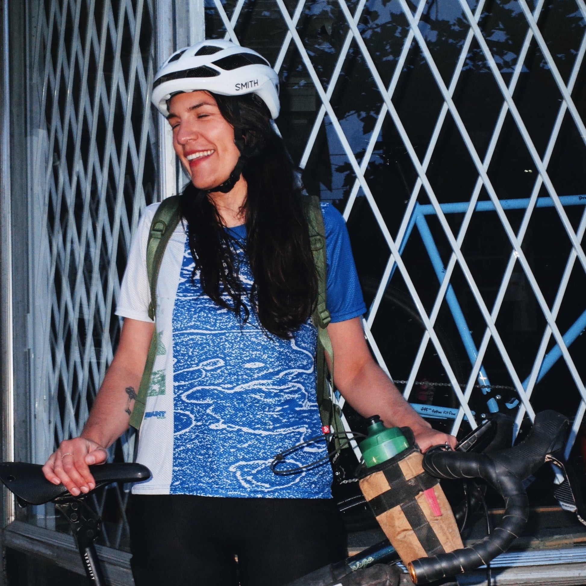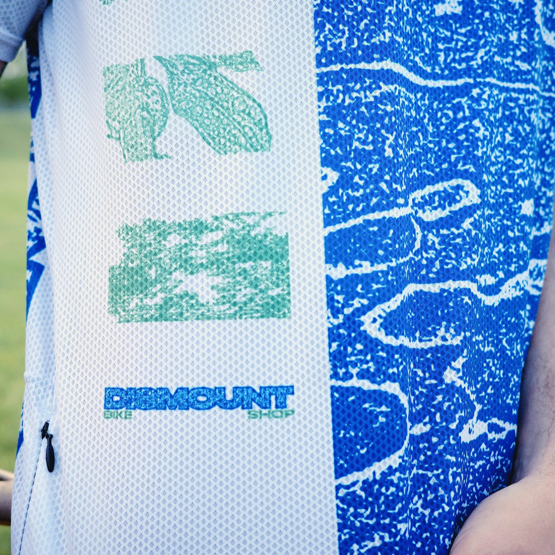 "I wanted this jersey to bring together a lot of the elements we got turned on to when we started riding - the wraparound print and colours come from a wetland near where I grew up, and I used a DISMOUNT wordmark that looks more at home on a rave flyer than a cycling jersey. Hopefully it speaks to someone and turns them on to cycling however they interpret it."
