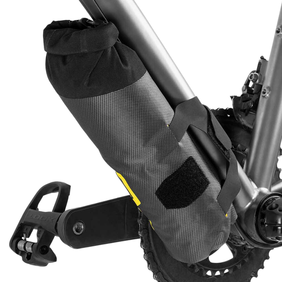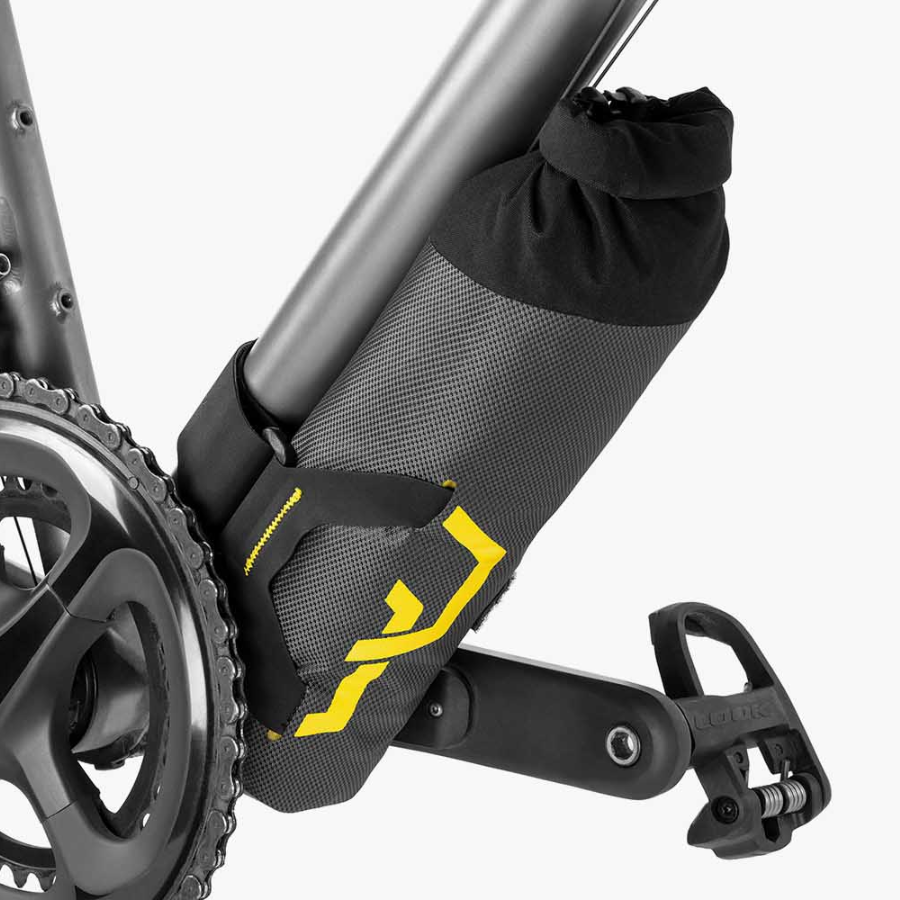 A bag that securely fastens to the downtube and similar diameter tubes to provide a versatile and compressible storage space for spares and long-distance essentials. It has enough capacity for a 710ml water bottle, allowing it to be used as a bottle holder bag for bikes with limited bottle storage space within the main triangle.