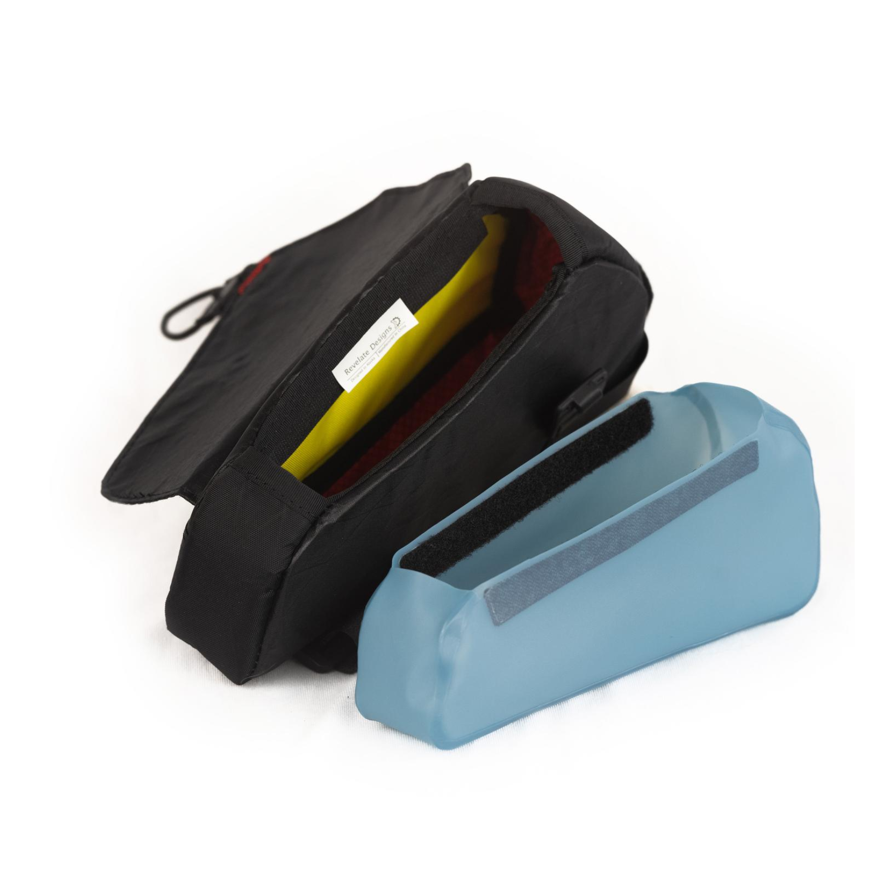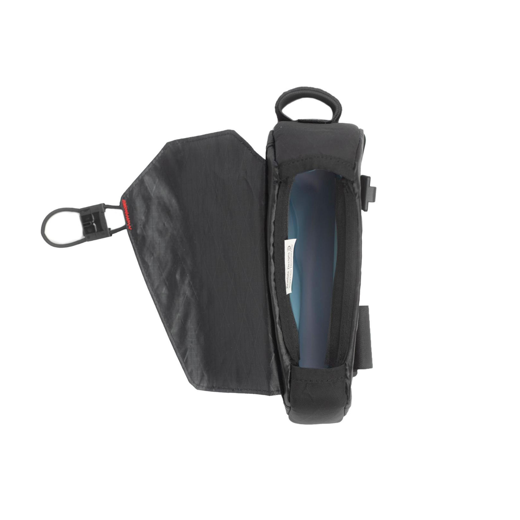 Please note: While the cover to this bag is designed to shed rain and spray, due to the large panel opening it is not a fully sealed bag or waterproof bag. Additionally, while the closure is secure there is the possibility that small objects can come out of the bag from rough trails or lying the bike on its side. A key clip is integrated into the bag but we recommend keeping your gummy bears in a ziplock.