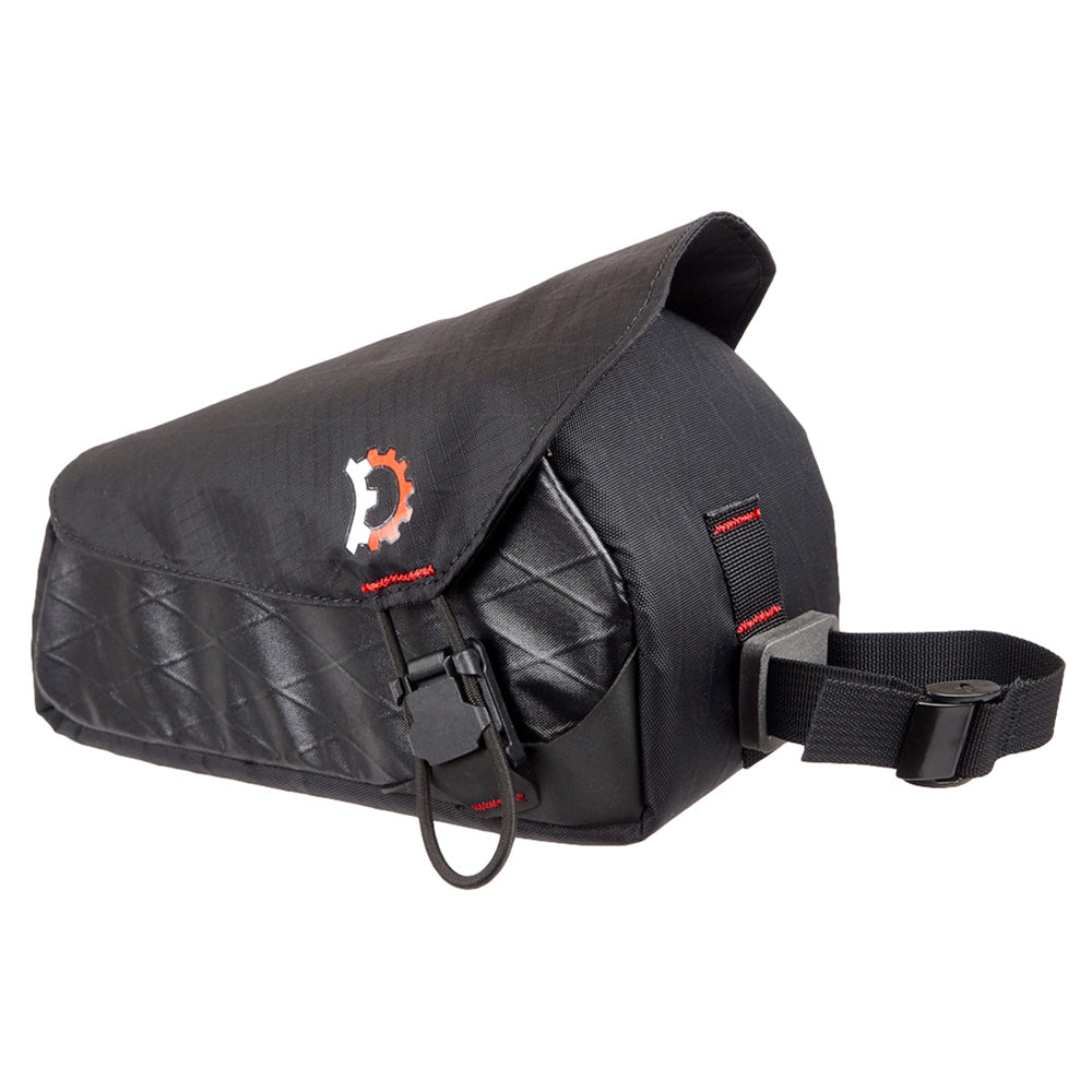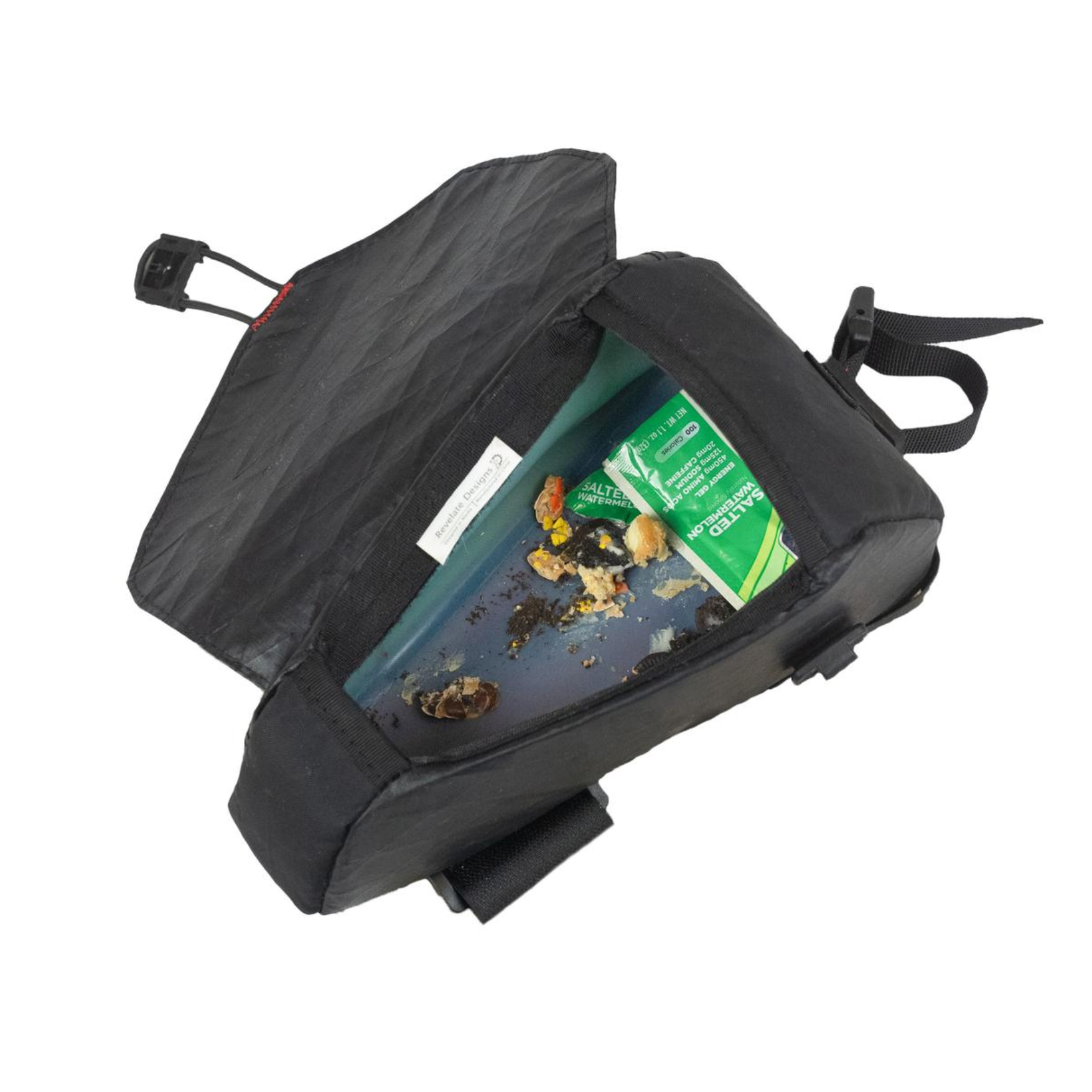 Please note: While the cover to this bag is designed to shed rain and spray, due to the large panel opening it is not a fully sealed bag or waterproof bag. Additionally, while the closure is secure there is the possibility that small objects can come out of the bag from rough trails or lying the bike on its side. A key clip is integrated into the bag but we recommend keeping your gummy bears in a ziplock.