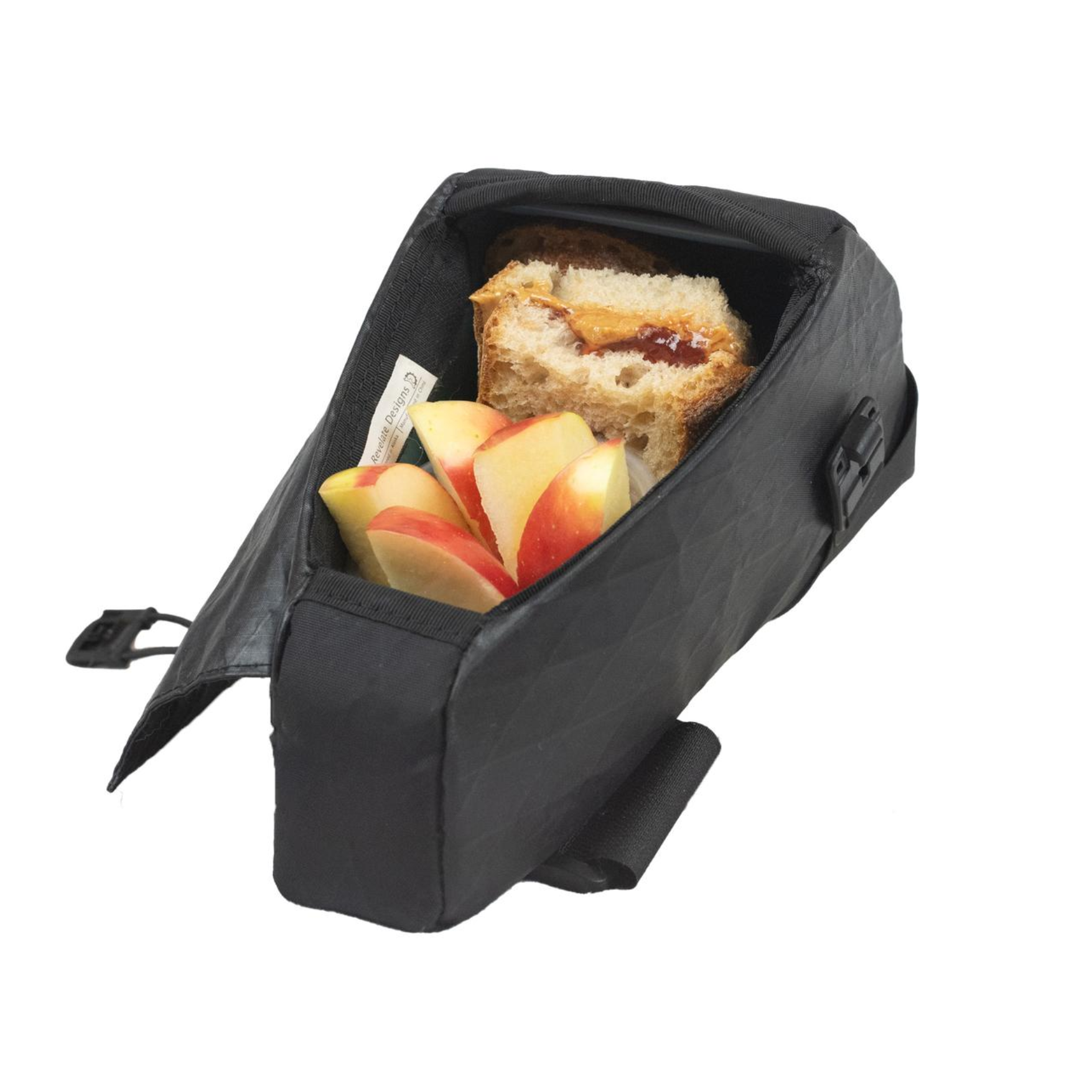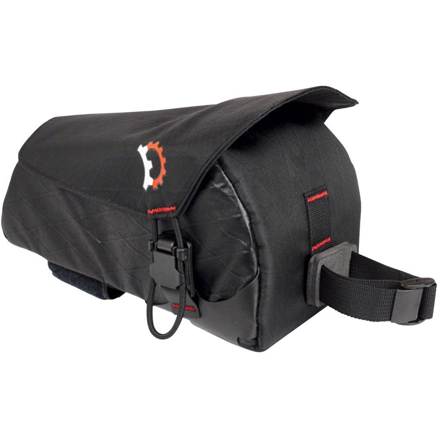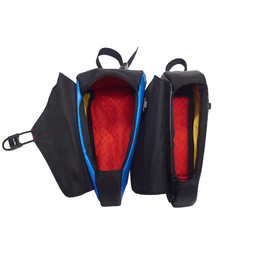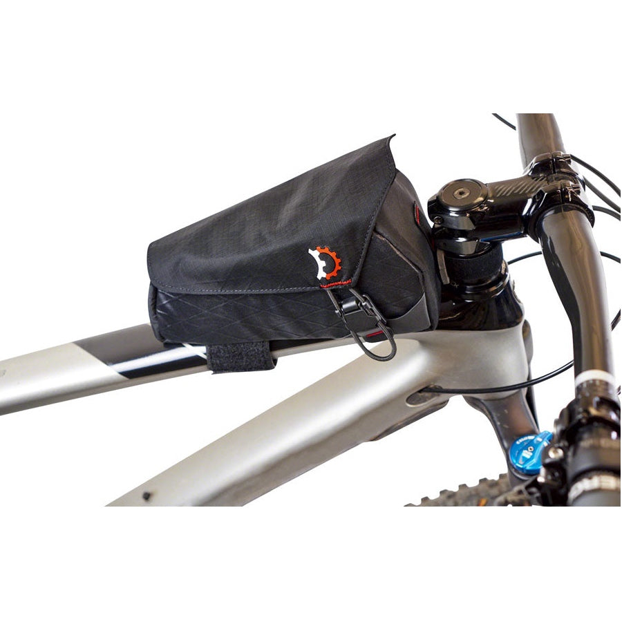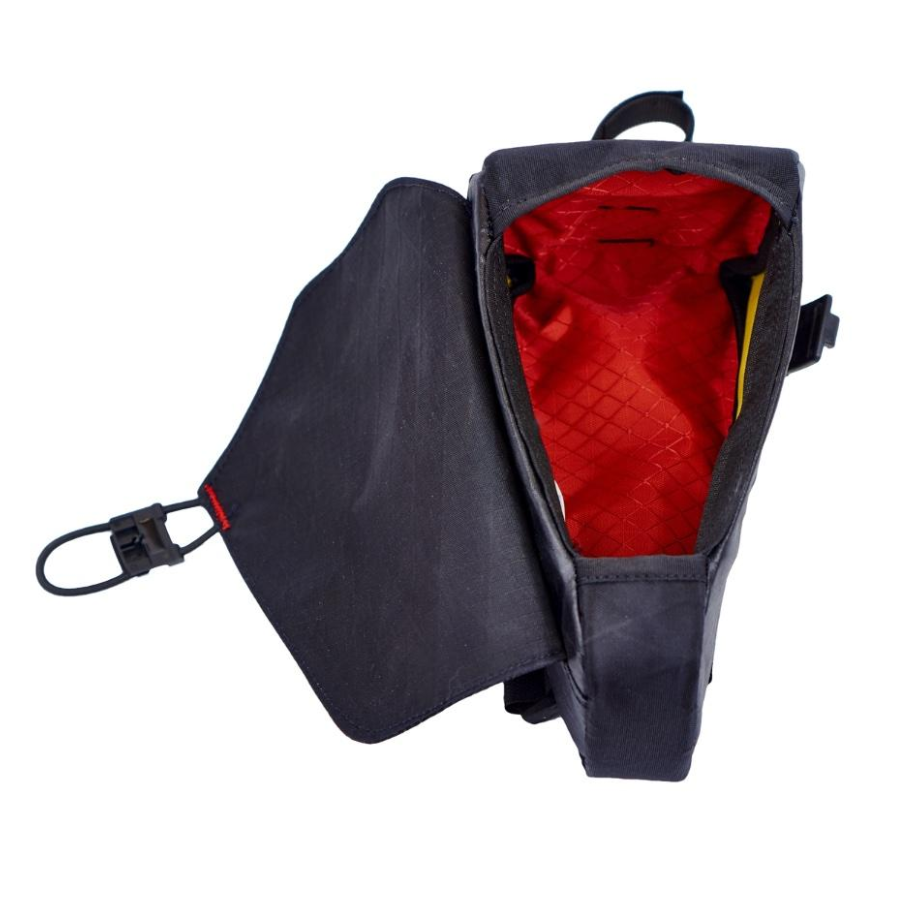 Please note: While the cover to this bag is designed to shed rain and spray, due to the large panel opening it is not a fully sealed bag or waterproof bag. Additionally, while the closure is secure there is the possibility that small objects can come out of the bag from rough trails or lying the bike on its side. A key clip is integrated into the bag but we recommend keeping your gummy bears in a ziplock.