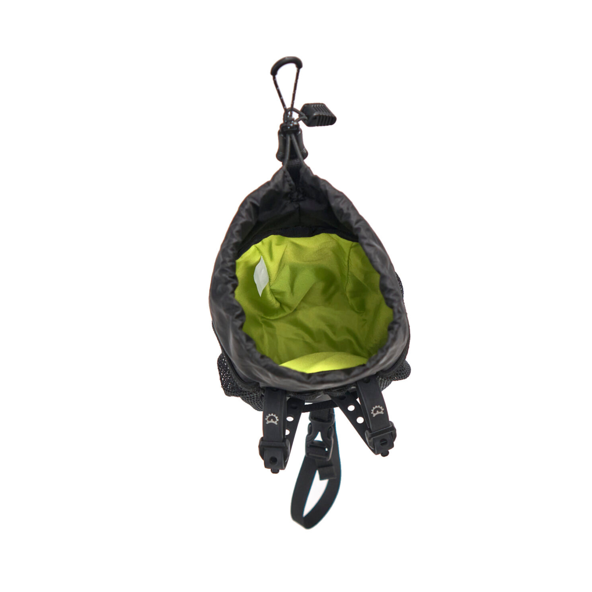 - Stem mounted feedbag for snacks, bottles, or small gear