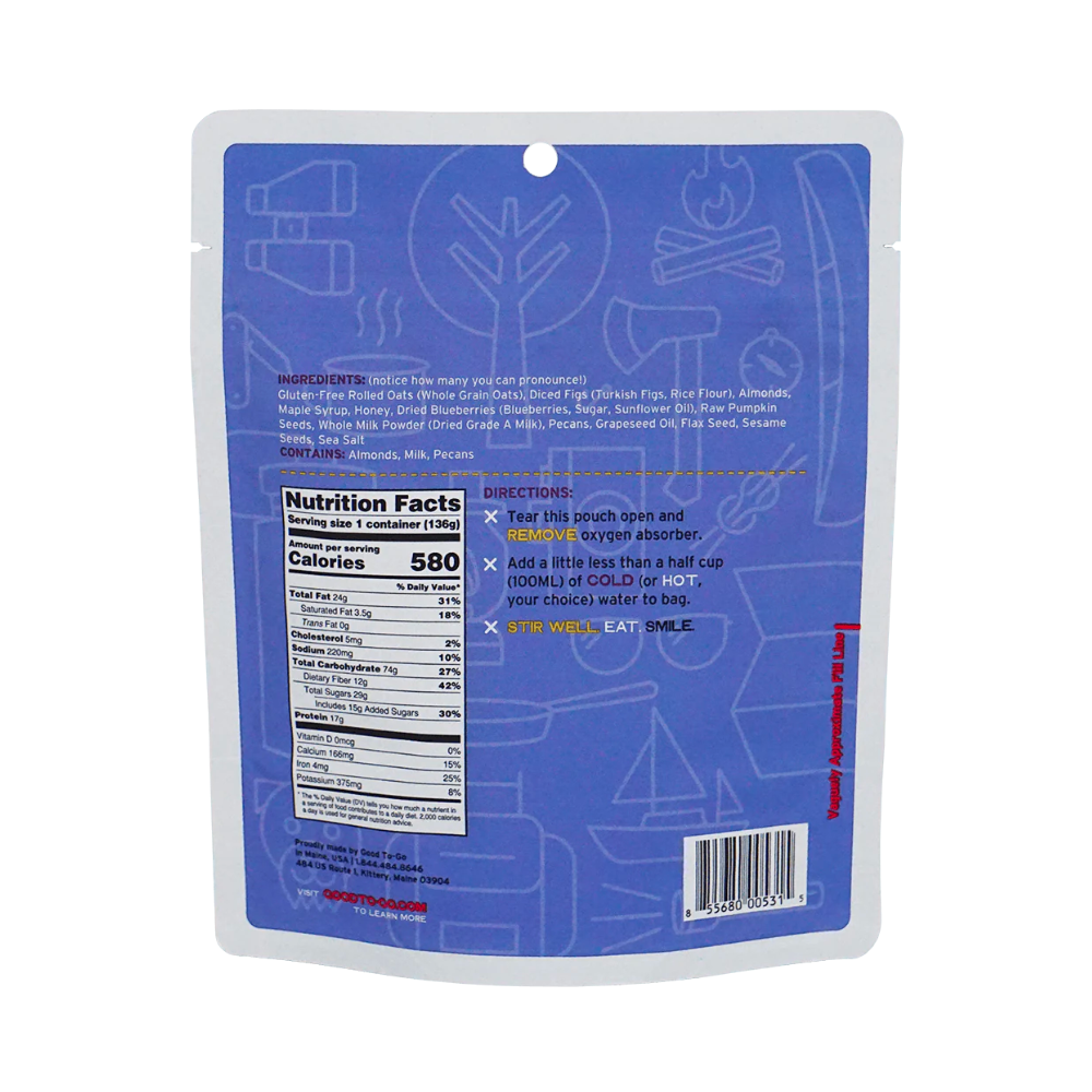 Gluten-Free Rolled Oats (Whole Grain Oats), Diced Figs (Turkish Figs, Rice Flour), Almonds, Maple Syrup, Honey, Dried Blueberries (Blueberries, Sugar), Raw Pumpkin Seeds, Whole Milk Powder (Dried Grade A Milk), Pecans, Grapeseed Oil, Flax Seed, Raw Sesame Seeds, Sea Salt