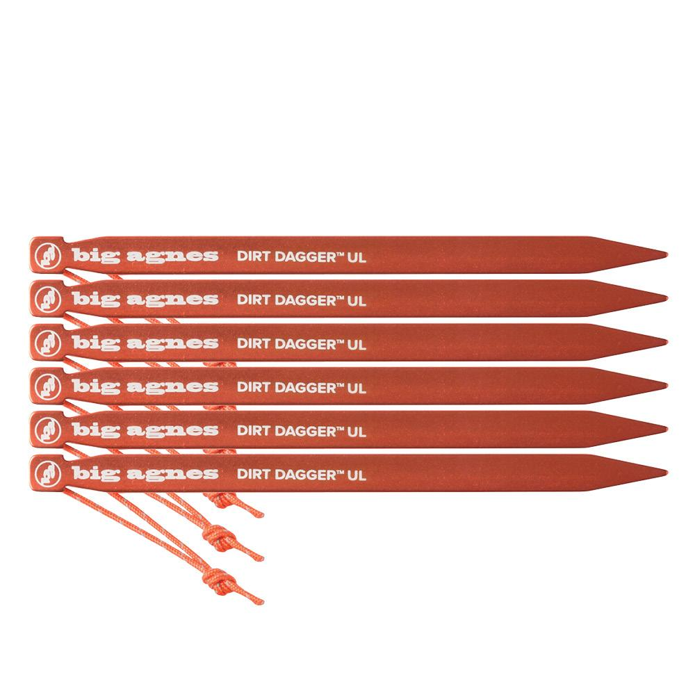 Dirt Dagger™ UL Tent Stakes are not your average stake. Designed with patent pending I-Beam aluminum construction for a stronger stake-out to keep your tent or shelter in place and to keep you safely protected from the elements. Big Agnes' lightest and strongest stakes ever, you’ll notice the difference with a 25% increase in strength to weight ratio when you’re staking out or tugging the cord loop pull to pack up. Available in select tent models and sold separately in three sizes, 6" for crazy and ultralight tents, 7.5” for superlight setups, and 10” for car camping and shelters. Grab an extra set for your gear cache or gift one to your favorite camper, the Dirt Dagger™ UL Tent Stakes will make all the difference at camp.
