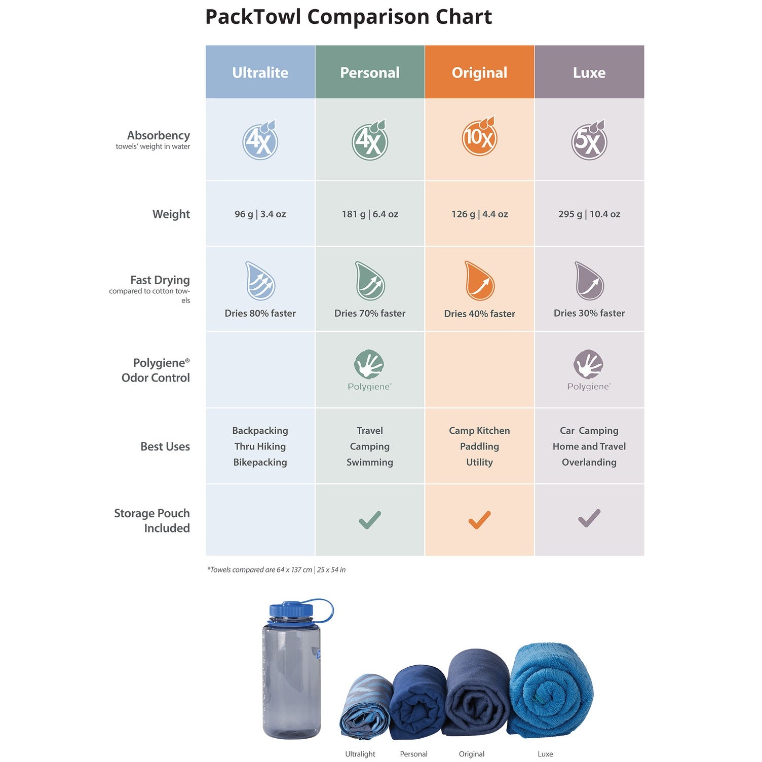 - Ultralight: Even in its largest size, the UltraLite towel barely tips the scales at just 5.1 oz.