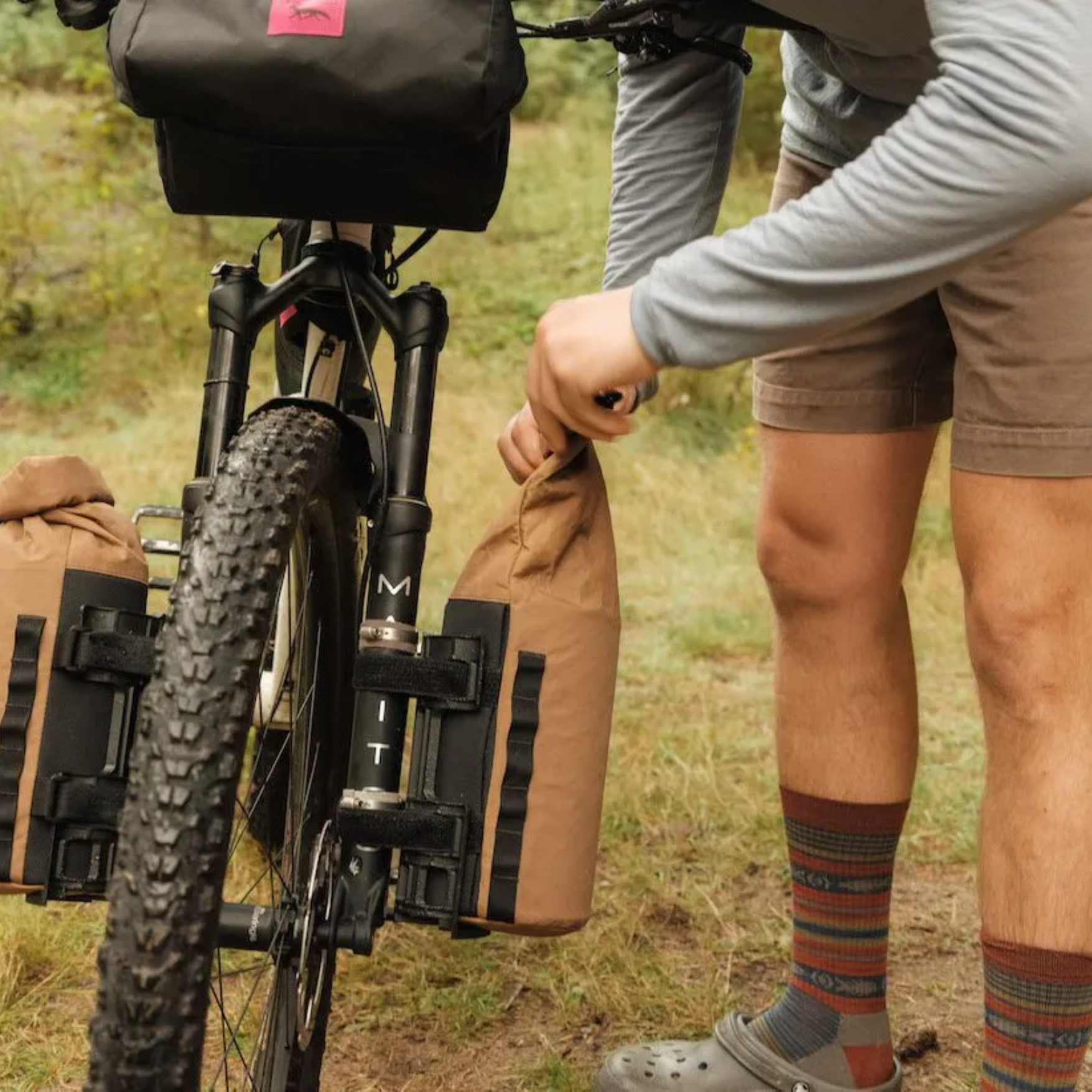 To prevent abrasion and wear-through where the Gemini contacts your cargo cage, ballistic grade recycled polyester fabric was chosen for the back panel. The sturdy velcro straps make it a cinch to attach and remove the bags from a cargo cage, and we sewed rubberized fabric to the back of the straps to mitigate movement of the bags and give you confidence to take on whatever road lies ahead. The daisy chain webbing on each side of the Gemini is a great place to strap on a small pump or lace some shock cord through to create a small net. Pro tip: The Gemini Fork Bag is a great solution for smaller riders who struggle to find storage options to fit their bikes. It is said that great things come in pairs, so take this as a sign to grab two for the “twin”!