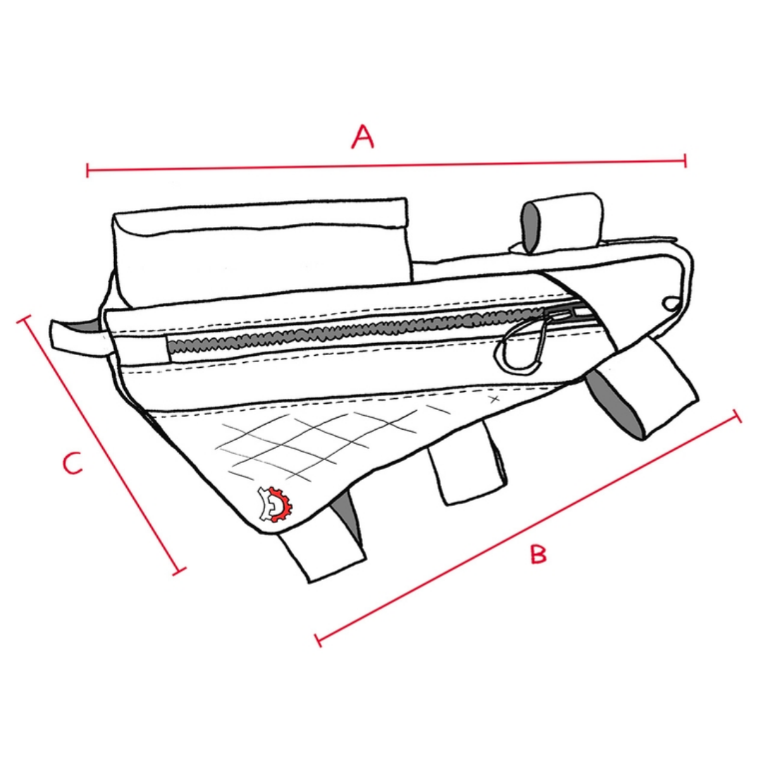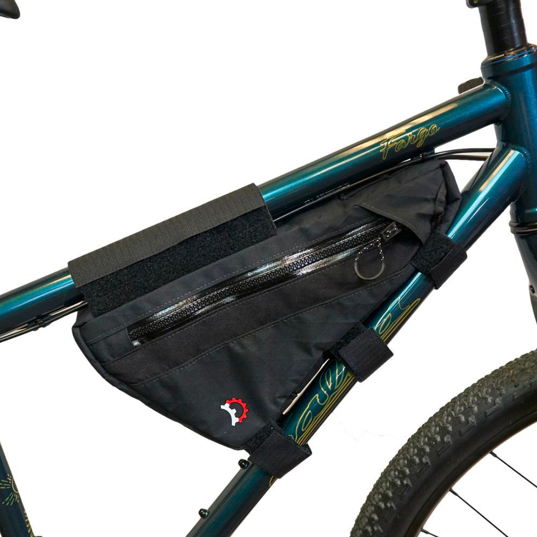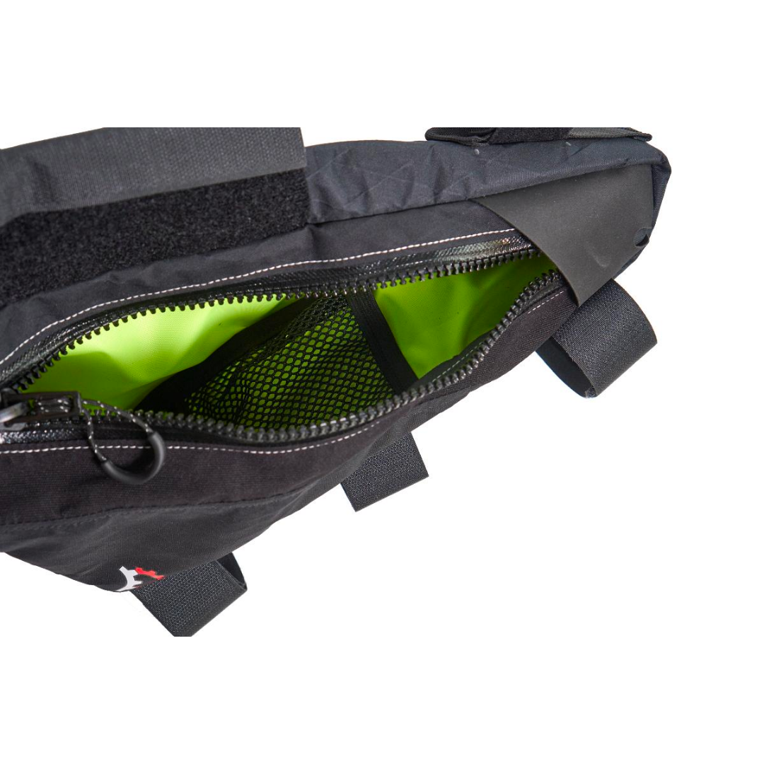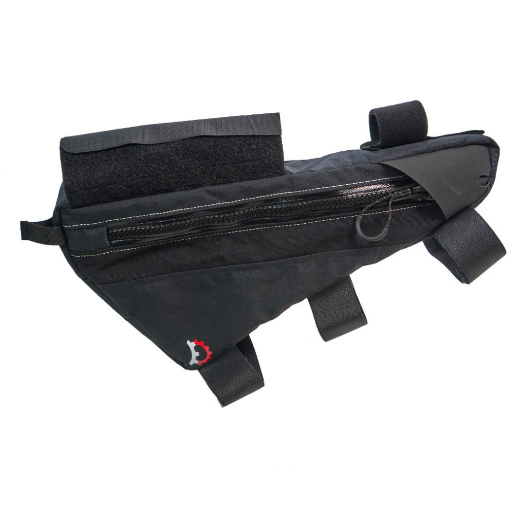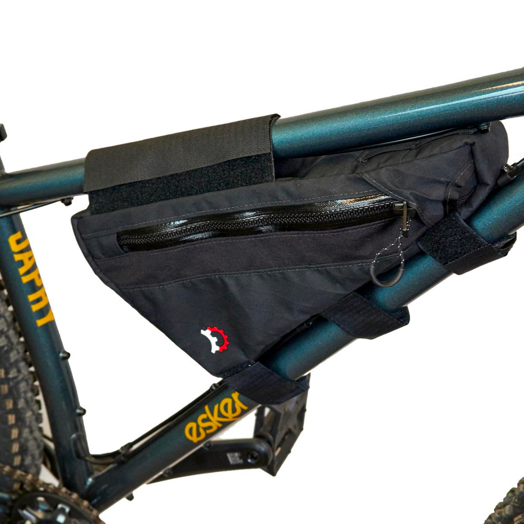 The Choss is the newest mountain bike specific wedge frame bag in Revelate's fleet. Made with 100% recycled content fabrics, the famous beefy zipper and stretch panel combo, and silicone coated hook and loop attachments, the Choss is ready to be put through the wringer. The main compartment houses a mesh pocket and is hydration system compatible. Stash smaller items you want handy in the flat left side pocket that also features a wire port. The Choss comes in two sizes that fit most hardtail frames and some full suspension bikes.