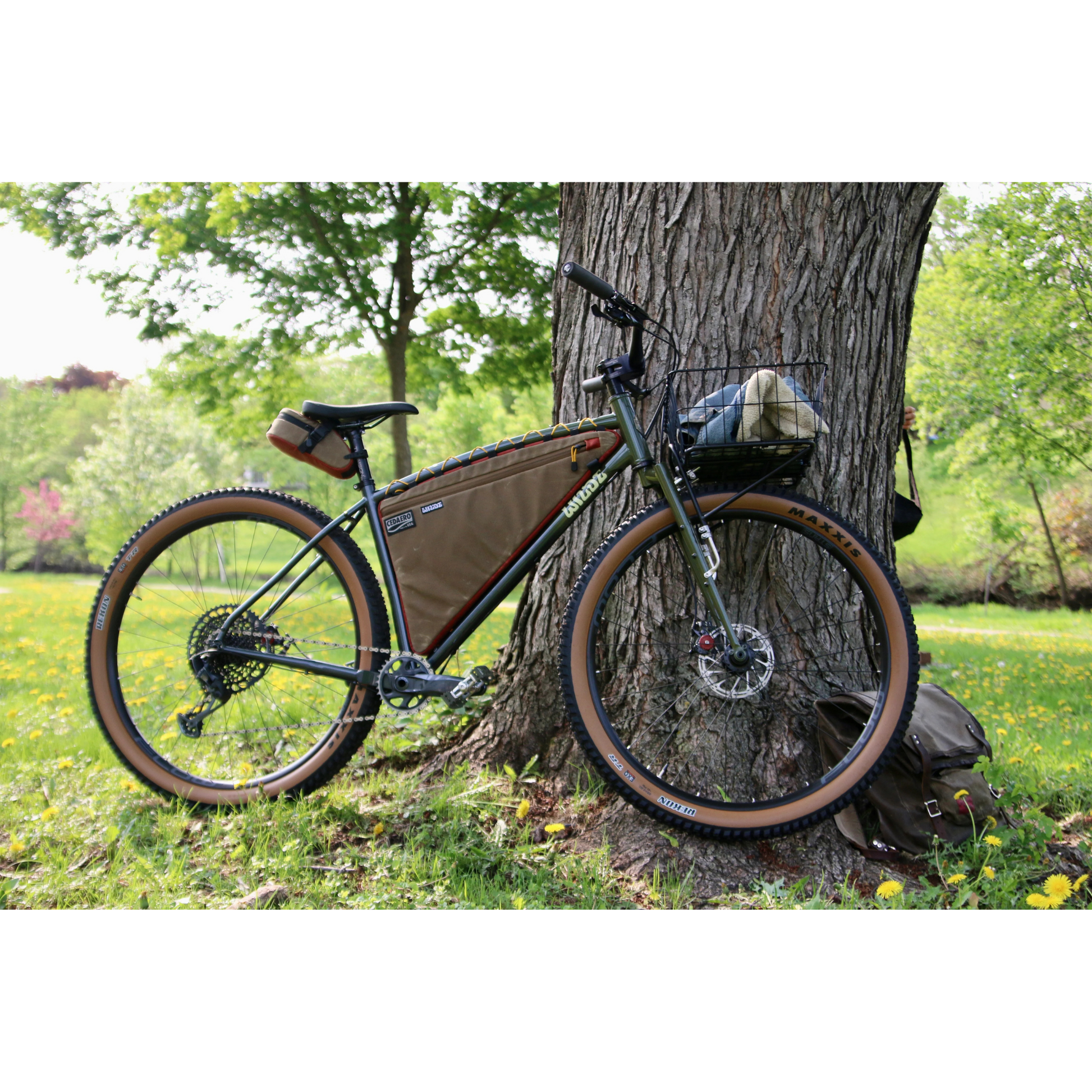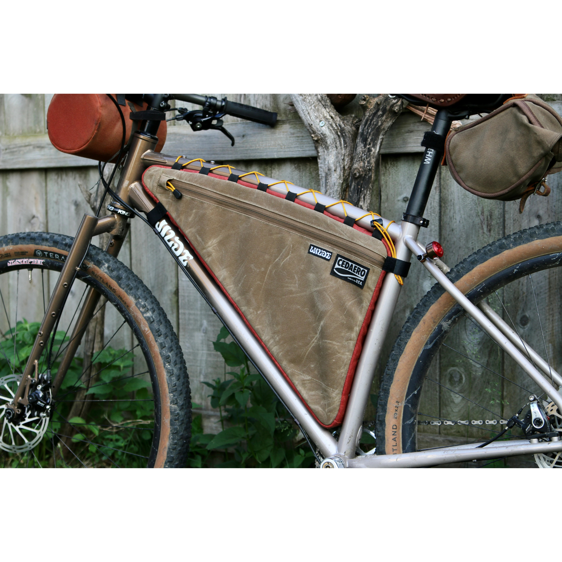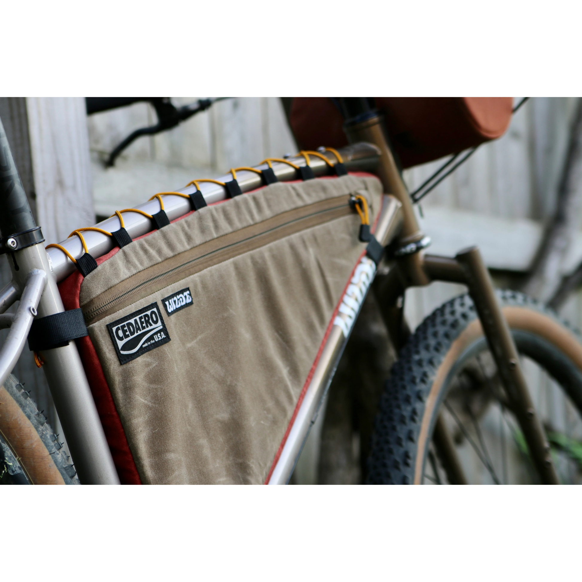 "At Cedaero, we believe a frame pack should fit your frame perfectly, and that's why we don’t offer stock sizes that only "kinda fit." Our frame packs are fully padded on all sides, which provides structure and protects your gear and your bike's frame. The 15oz waxed canvas exterior fabric options are water resistant, and hold up to hard use. Waxed canvas packs get black liner and we added a mesh pocket inside for sorting out items you want easy access to. We opted to use a #9 Ideal water resistant zipper that opens easily without getting jammed up. The Nanosphere coating on the zipper repels water as well as dirt and grime. No, it’s not waterproof, but from our experience it keeps the water out, is easier to use, and lasts far longer than urethane coated zippers."