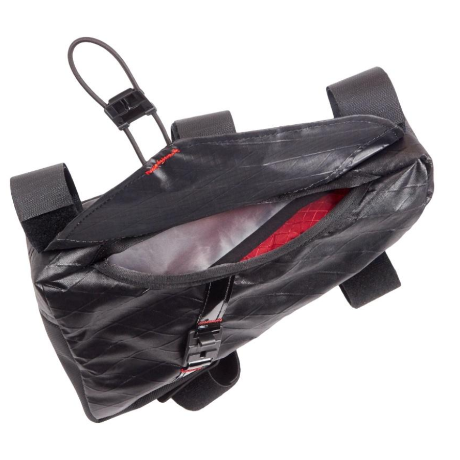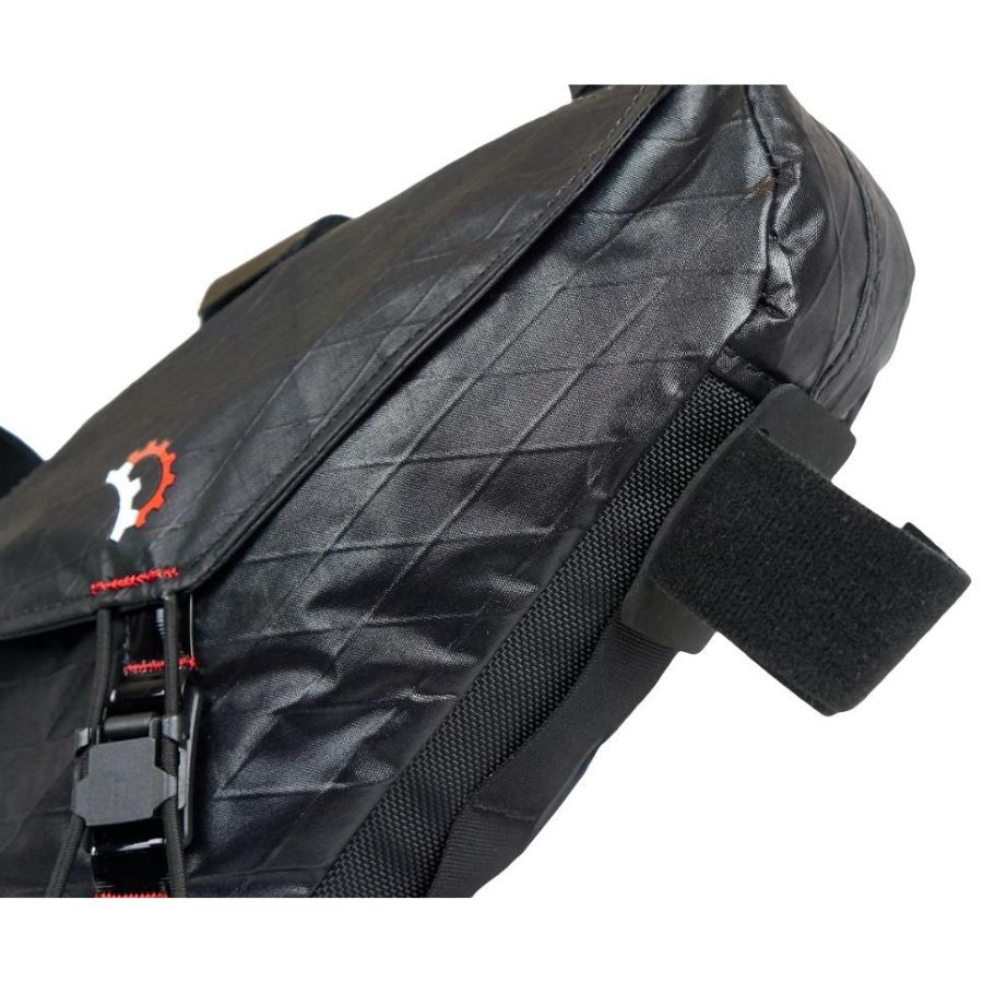 This mid-frame fitting zipperless bag was painstakingly developed to work well whether the bag is empty or full to the brim. With a short length that would make zipper access difficult, we used design knowledge from the popular Mag-Tank cockpit bag combined with a decade of tried and true frame bag manufacturing. The result is a single-handed accessible, panel opening frame bag with an effortless magnetic closure.
