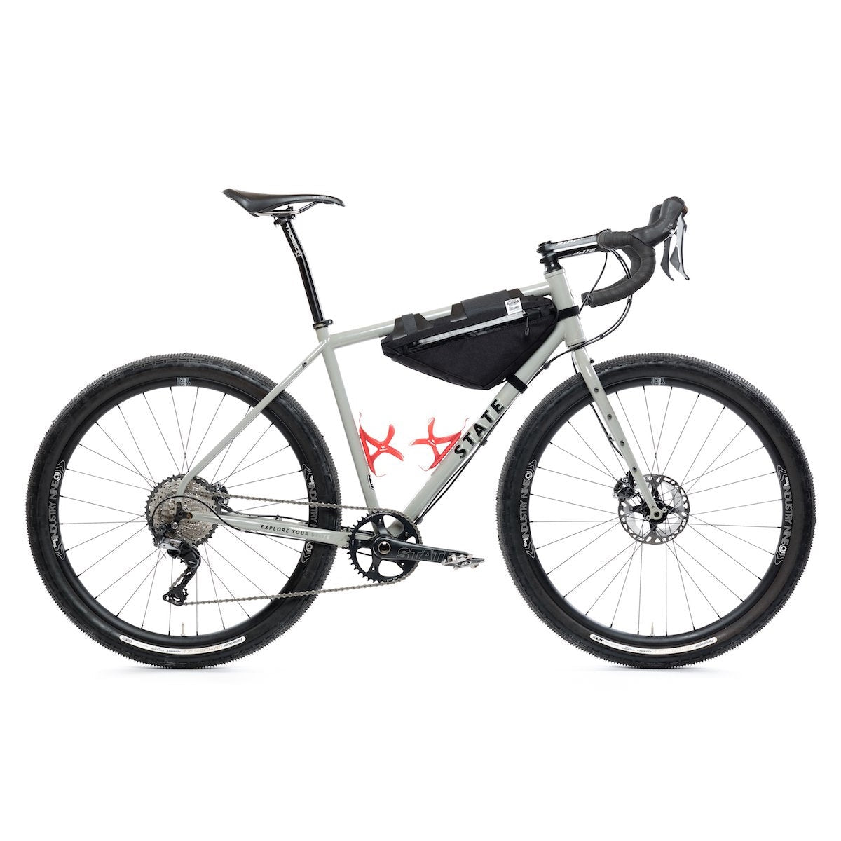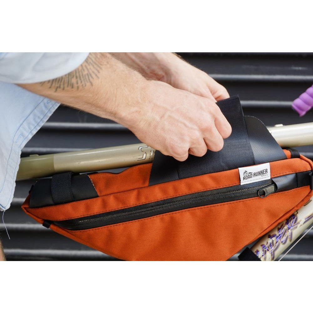 Perfect for daily use and long weekend trips. This bag is made to fit on most frames, most sizes, and up to two large water bottles on larger frames and one large water bottle on smaller frames. The Wedge is great for bike touring, bike packing, and any other type of more extended riding where more space is needed. Use this bag on your CX bike for some trail ripping, then mount the bag on your MTB for some backcountry riding. Hold that extra 1L bladder, tools, flat kit, food, gloves, and an extra layer with ease.