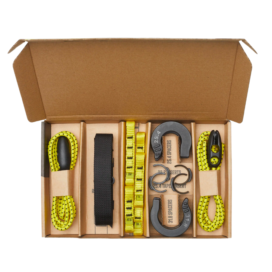 JACK comes with two adjustable length bungees (1.2m) with snake heads to secure your baggage, a bunch of spacers and inserts and 5 different length Loadstraps to fit JACK to your bike.