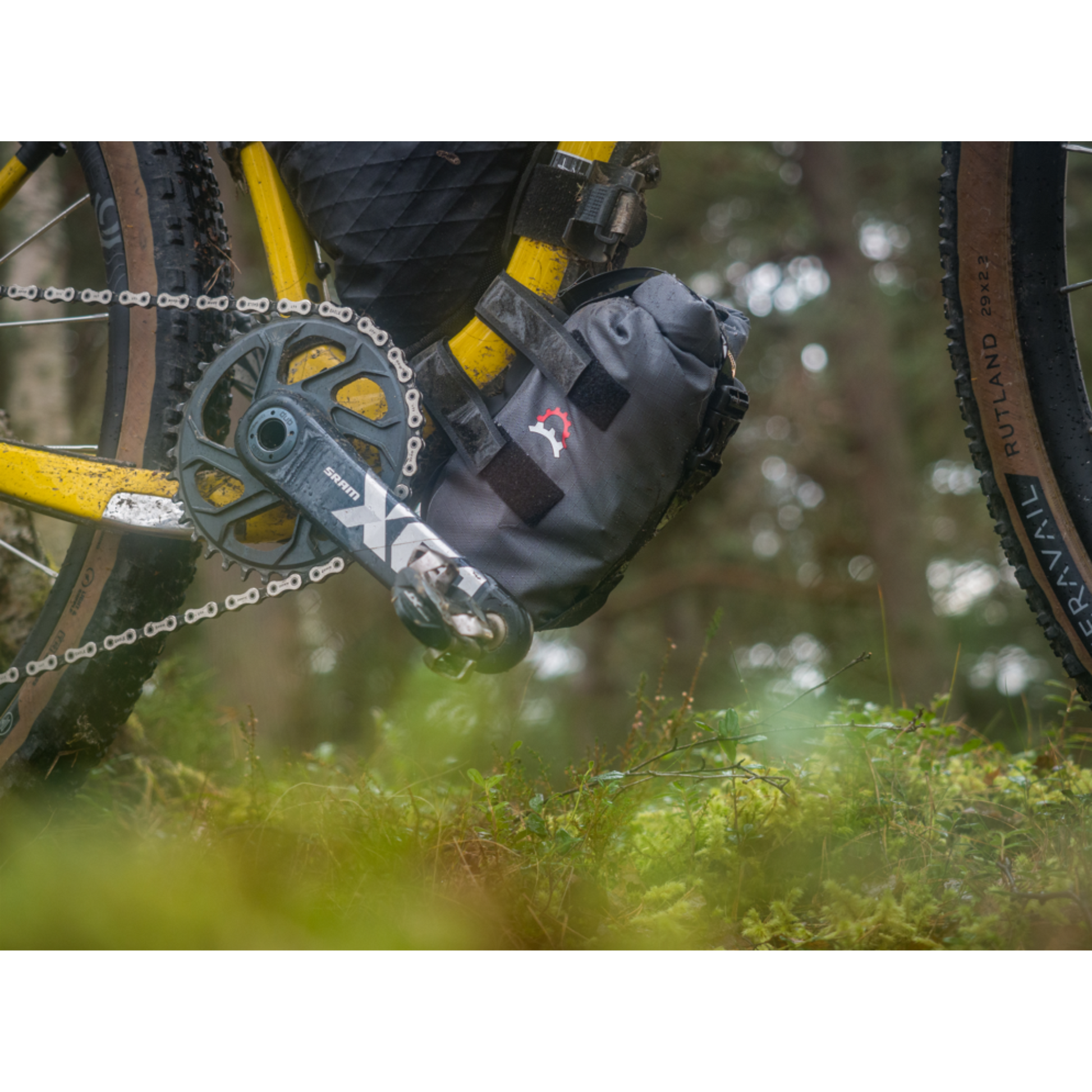 The Revelate Designs Joey Downtube Bag is a fully welded, waterproof bag designed for bikes with limited frame space or extra storage needs. Mounted near the bottom bracket, it keeps hard-to-pack items low for better stability. A compression-molded foam panel and silicone-coated straps ensure a secure fit on rough terrain. The roll-top closure allows easy access and prevents zipper issues in muddy conditions.