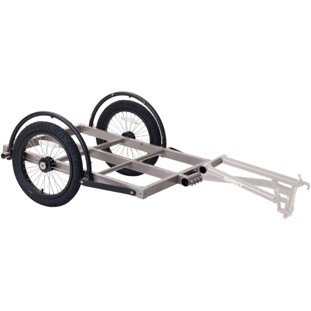 Surly's hitch system is designed to be as universal as possible. This hitch will likely fit your bike. It works with full-suspension frames, disc brakes, rear racks and fenders. It adjusts to accommodate hub widths from 120 – 145mm and allows you to align the centreline of the trailer on the centreline of the bike. It will work with bikes that have wheels as small as 20” and as large as 29” while keeping the bed level with the ground. This is especially important when you are hauling long items that hang off the back of the trailer (lumber, tubing, ladders, etc.). Our hitch will attach to your bicycle one of two ways: our direct mount Hitch Nuts or our Trailer Skewer. Our Hitch Nuts are 10 x 1mm threaded inserts that thread directly into any of our frames that come with our touring dropouts à la the ECR, Ogre and Troll. If you’re using a QR rear hub, we also have a skewer mounting system available. If you’re using a hub with a 3/8” threaded, solid axle… yeah we don’t have that.