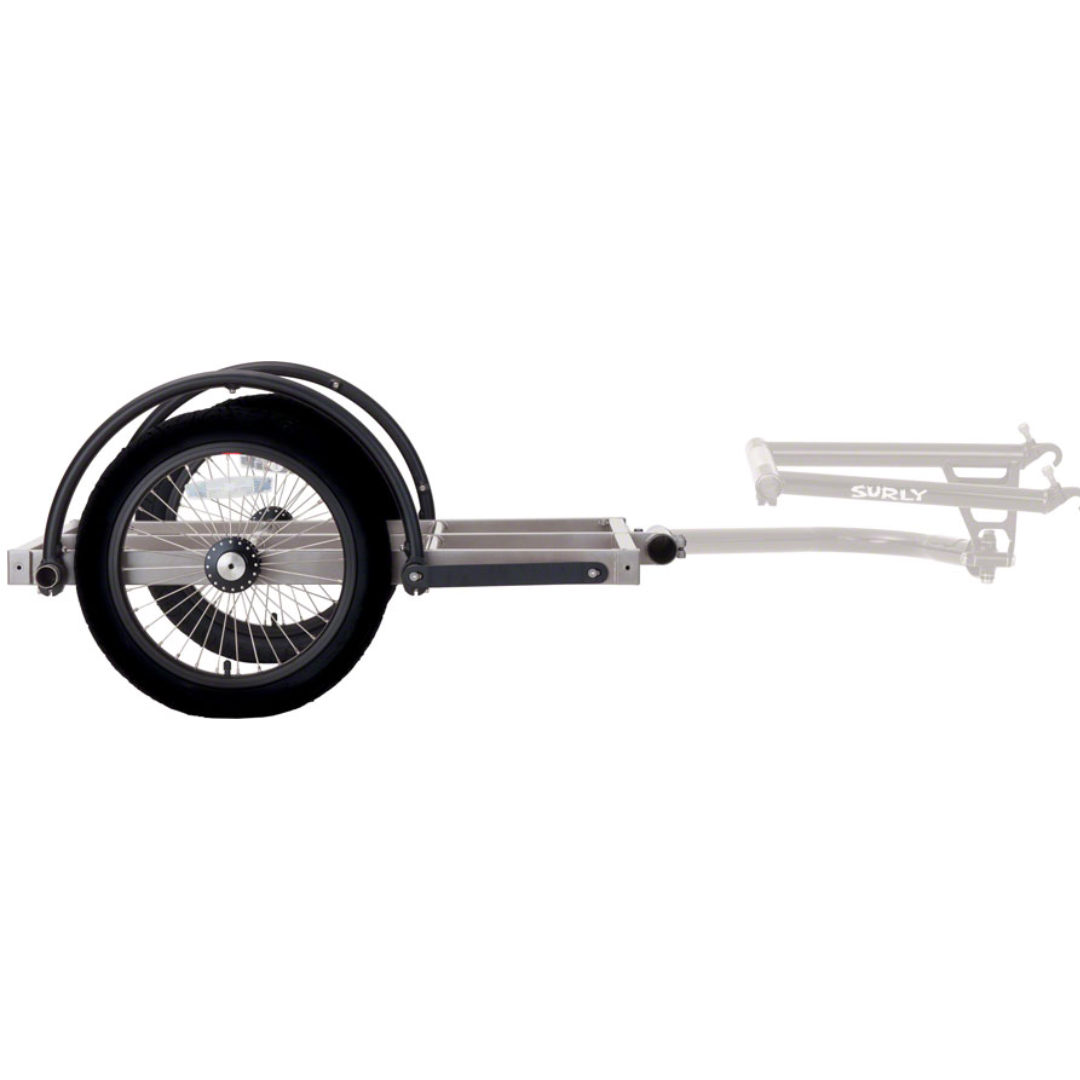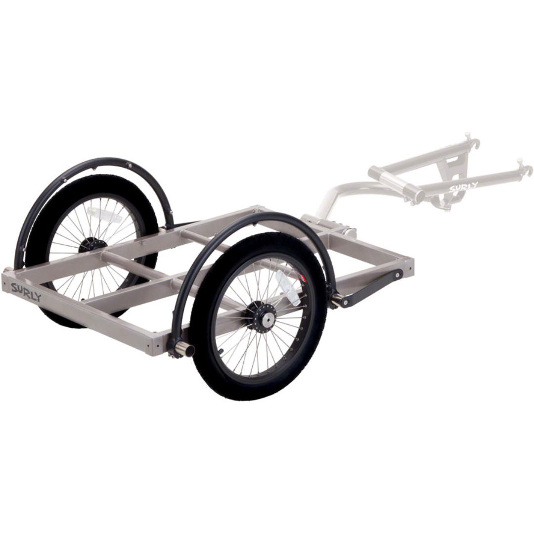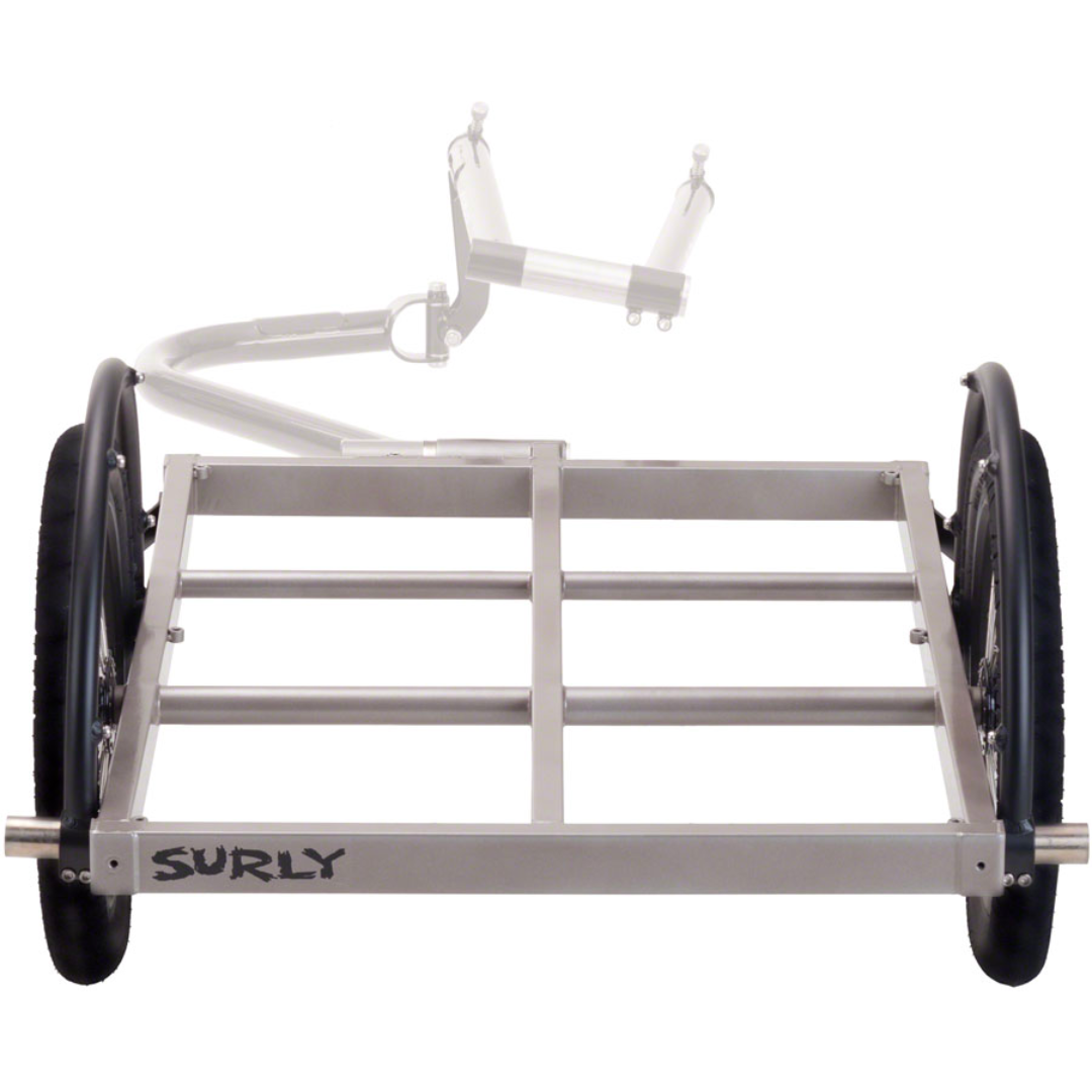 You are looking at Surly's Ted trailer! It is 32” long and 24” wide. Ted is basically the same as the Bill trailer but shorter. It’s made of TIG-welded Chromoly steel for strength and long life. Surly studied a lot of other trailers and thought about what they want out of a general purpose trailer. From its construction to all the details, Surly is proud to offer you a trailer you can use for a long, long time to carry all kinds of stuff. When you don’t need it, it easily disconnects from your bike and when you’re ready to use it again it attaches just as quick and stays attached until you remove it.