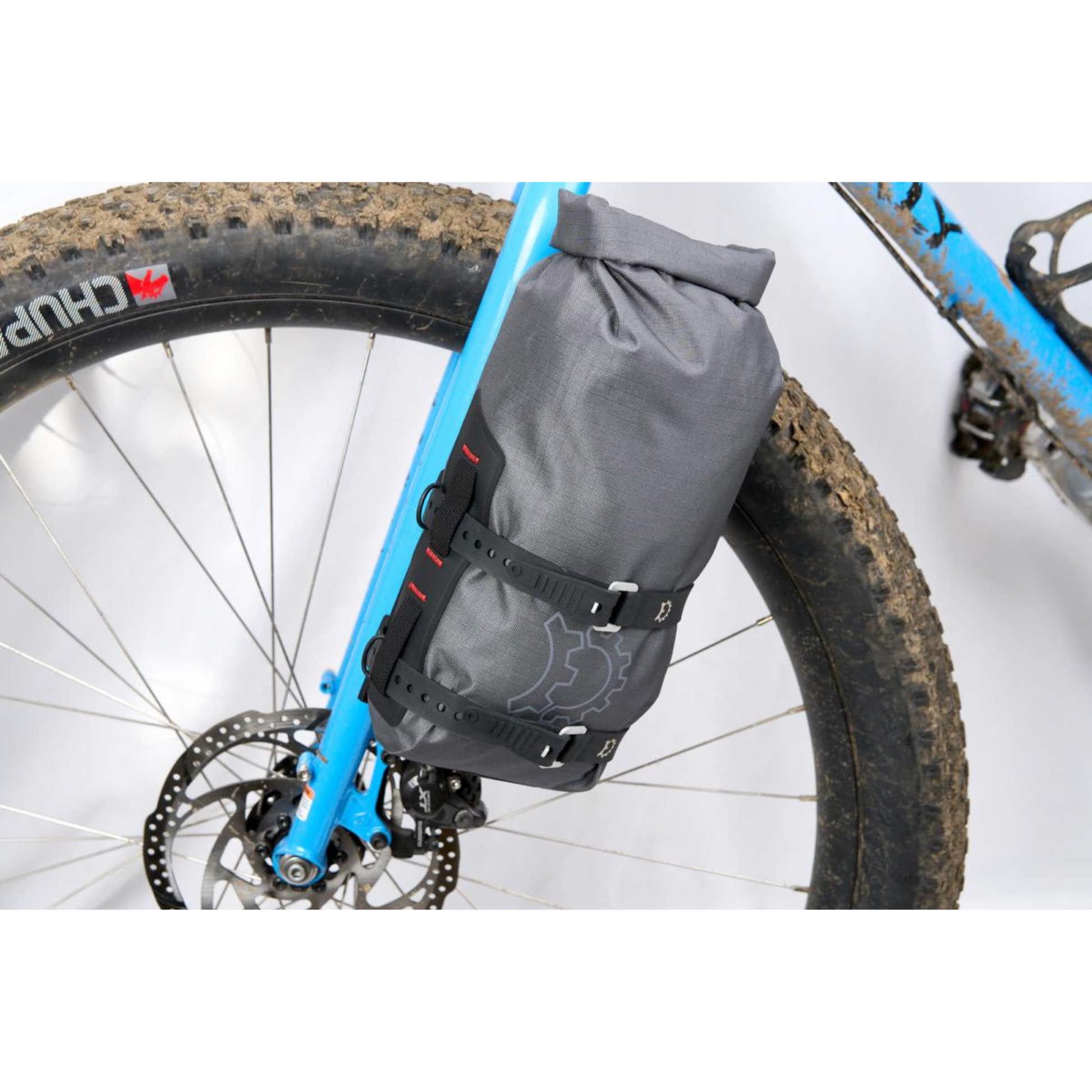 Its slender profile and webbing slots make it easy to strap onto cages like the Revelate Designs Tarsier Cage or other 3-bolt cargo cages. This bag is for riders who need bombproof reliability in a minimalist package.