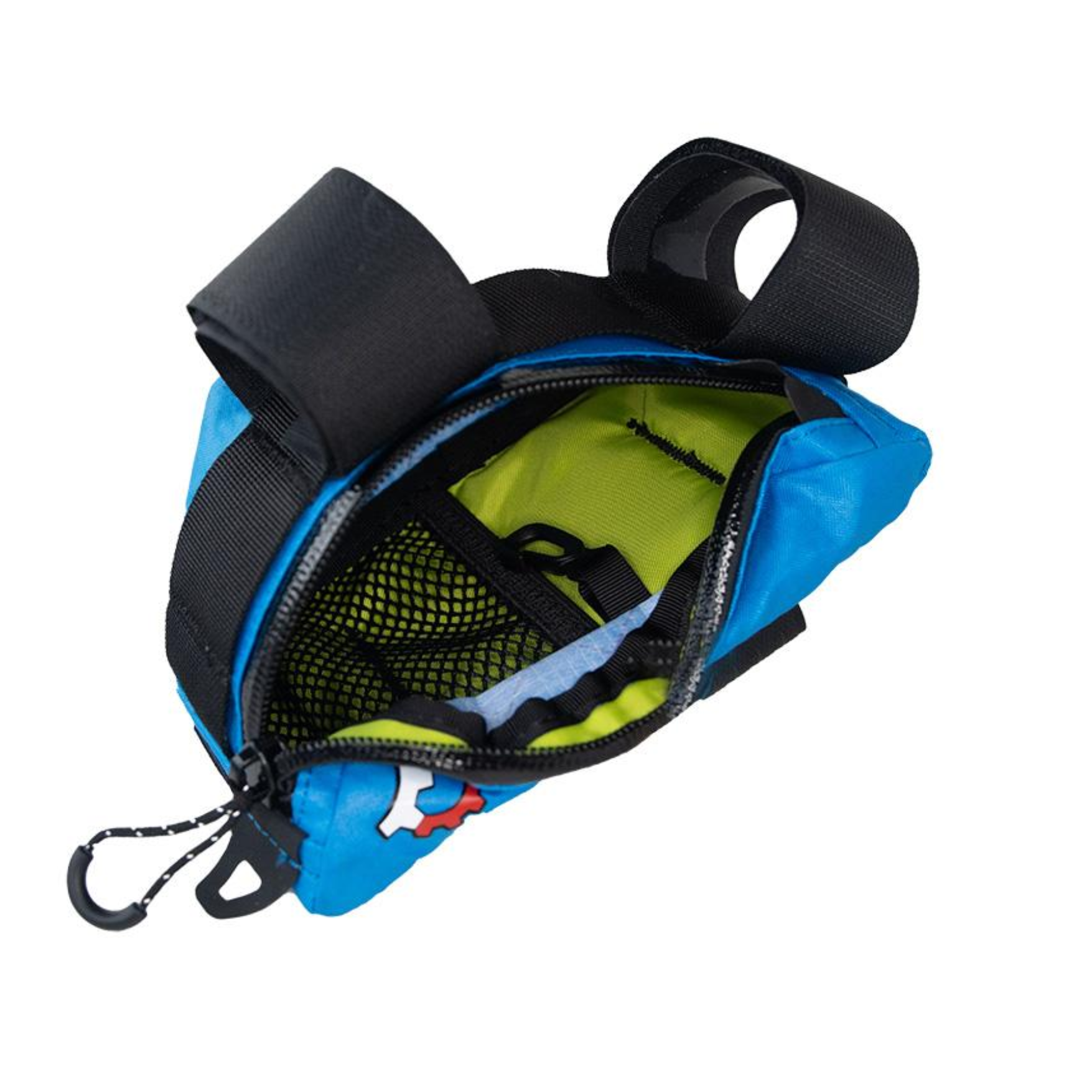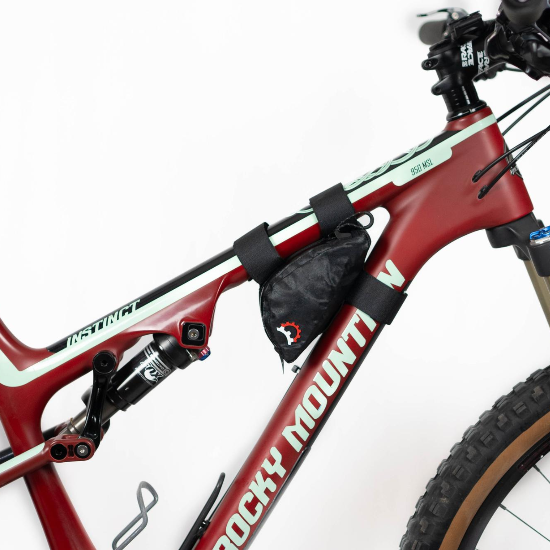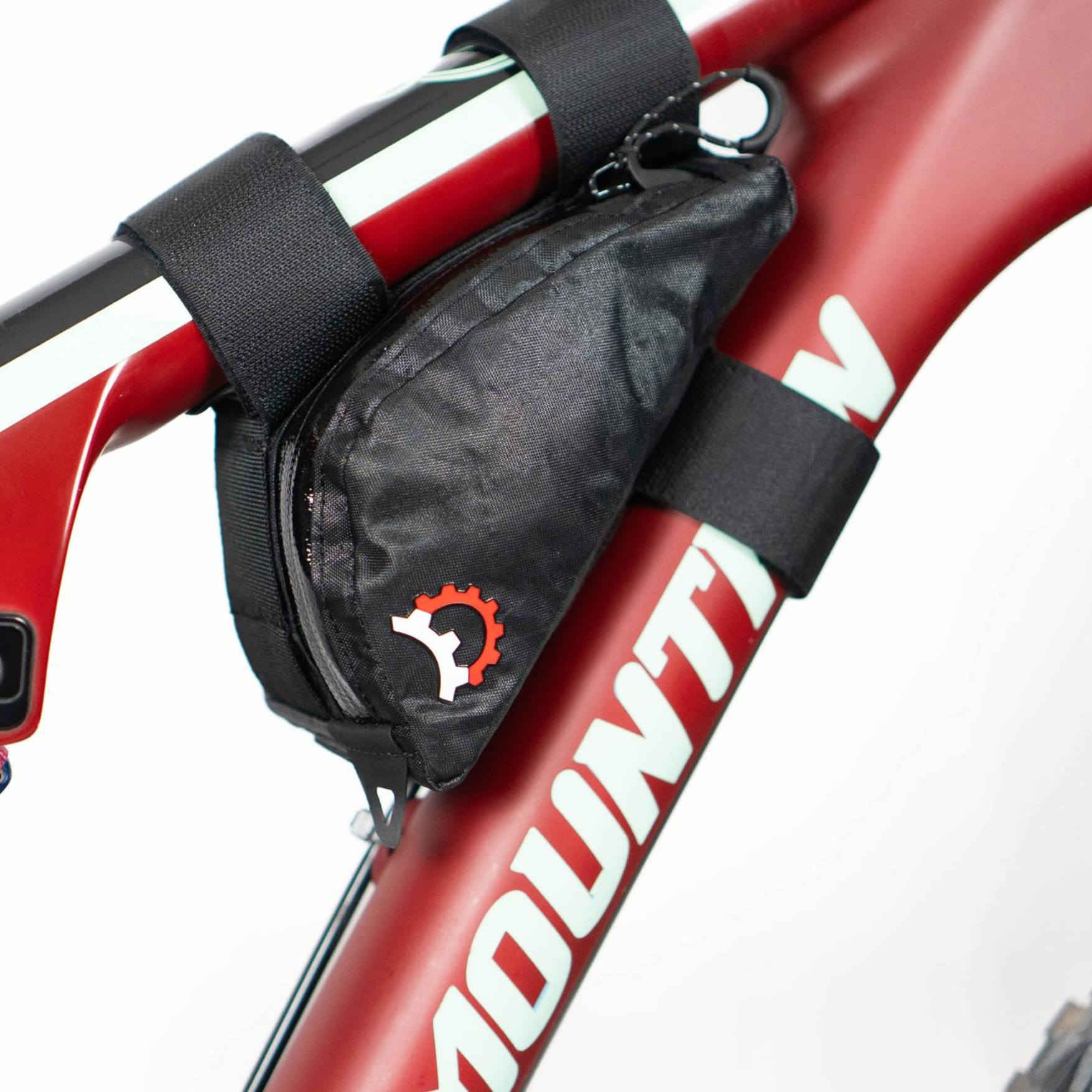 Introducing the Cranny, a micro frame bag for day ride essentials! This small but mighty bike bag was designed to fill under utilized space especially on full suspension bikes. The Cranny is the smallest frame bag Revelate has ever made and about half the capacity of its larger counterpart, the Nook. The panel opening design with a curved zipper provides access to the interior with a small mesh organizer pockets and key clip. Silicone backed hook and loop straps lock to the frame and are easy on finishes. Whether you're riding a mountain, road, fat or gravel bike, the Cranny packs it in!